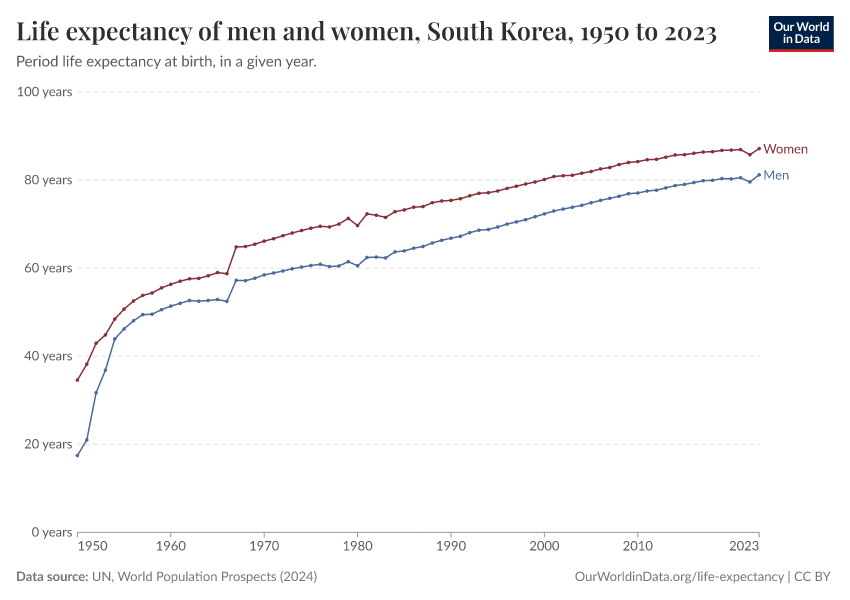 In the chart, you can see life expectancy at birth for men and women in South Korea.