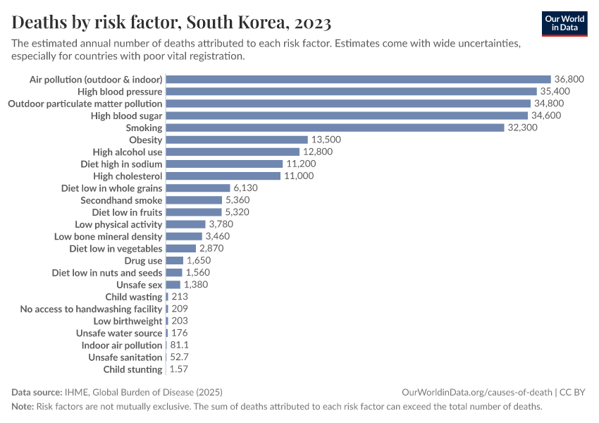In the chart, you can see modeled estimates for how many people in South Korea die prematurely as a result of various risk factors. Note that the same death can be attributed to multiple risk factors, so the death tolls from different risk factors cannot simply be added up (this is why their sum can be higher than the total number of deaths).