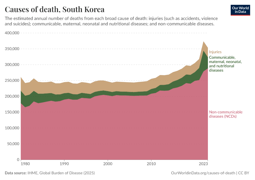 In the chart, you can see the breakdown of deaths in South Korea by these broad categories. In 2023, 34,900 died from communicable diseases, 288,000 from NCDs, and 30,000 from injuries.