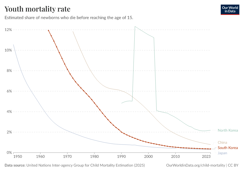 The latest data, referring to 2023, shows that 0.4% died before the age of 15 in South Korea.