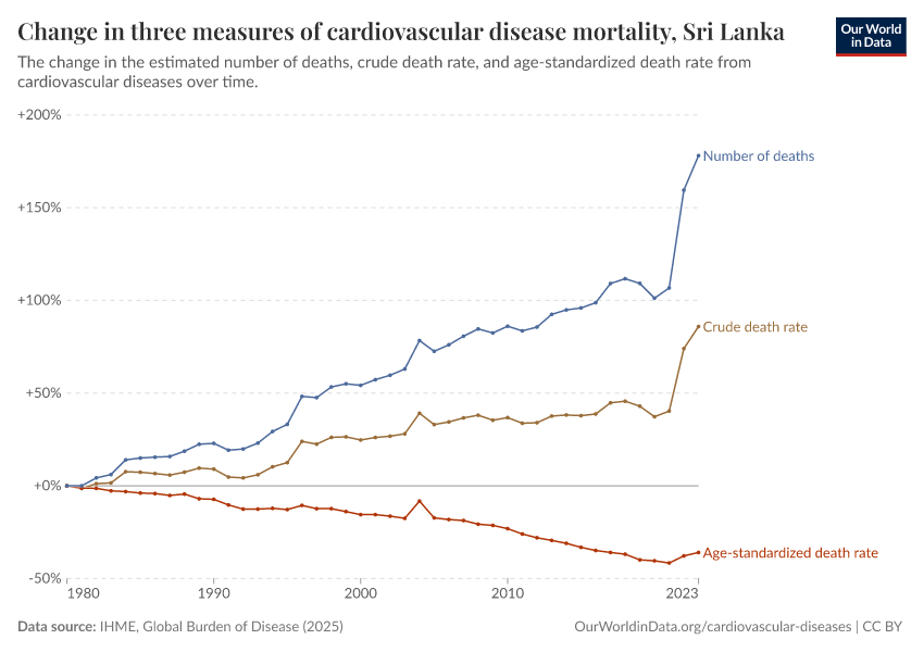 There are several metrics we can use to understand mortality: the total number of deaths, the crude death rate (which simply divides the number of deaths by the country’s population), or the age-standardized death rate, which holds the age structure of the population constant, removing the effect of population aging from the trend.