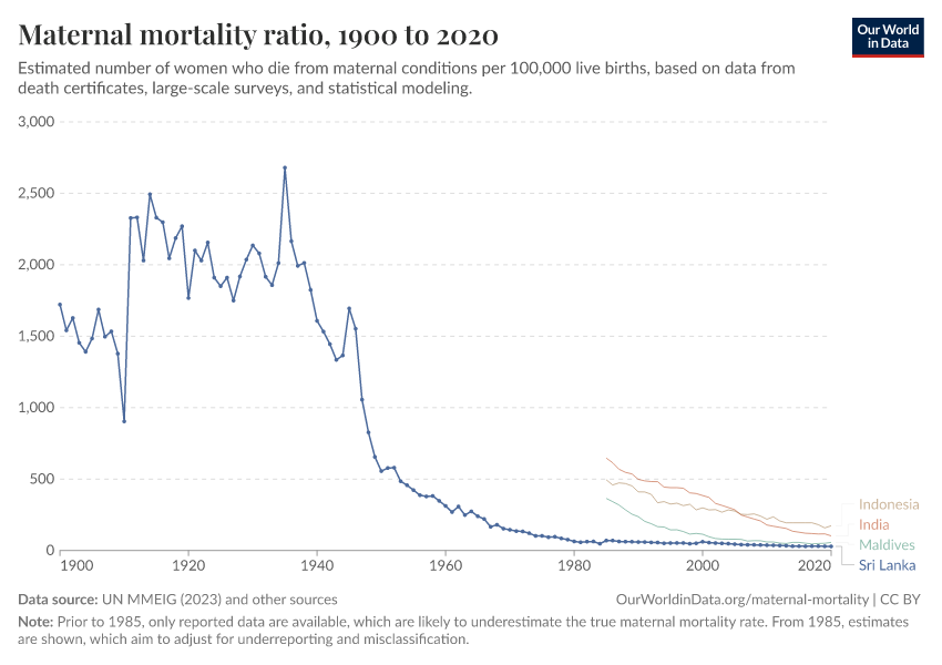 In the chart, you can see Sri Lanka’s maternal mortality rates over time, alongside neighboring countries for comparison. This is measured as the number of deaths per 100,000 live births.