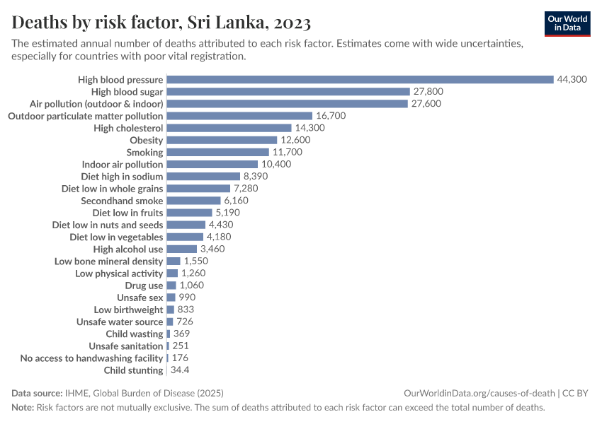 In the chart, you can see modeled estimates for how many people in Sri Lanka die prematurely as a result of various risk factors. Note that the same death can be attributed to multiple risk factors, so the death tolls from different risk factors cannot simply be added up (this is why their sum can be higher than the total number of deaths).
