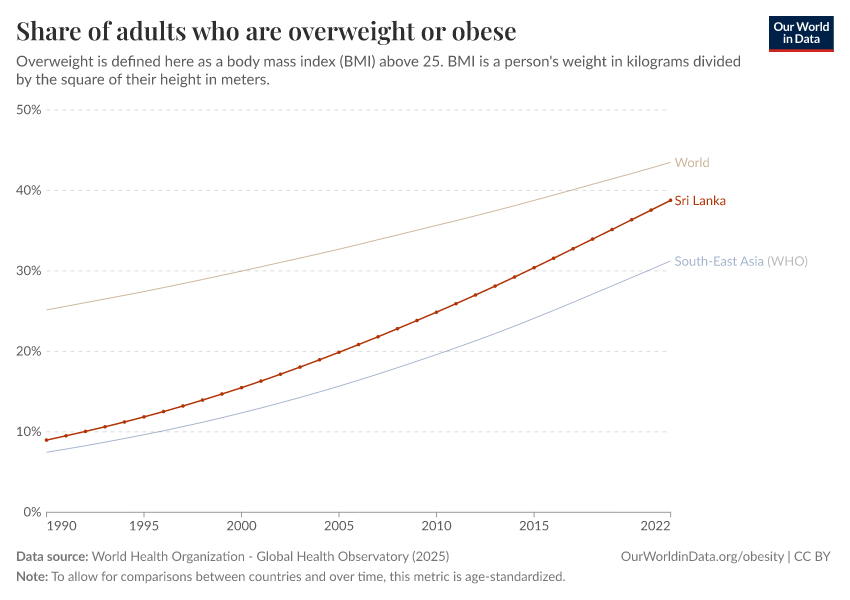 In the chart, you can see the share of adults in Sri Lanka who are overweight or obese. This is defined as having a body mass index (BMI) equal to or greater than 25. This is shown alongside the global and regional averages.