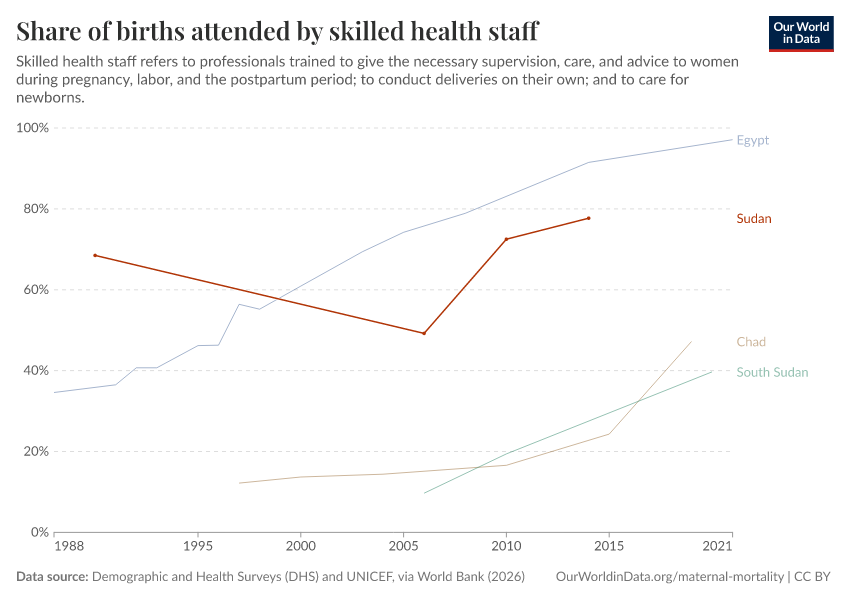 In the chart, you see the share of births attended by skilled workers in Sudan, alongside its neighbors. In 2014, this share was 78%.
