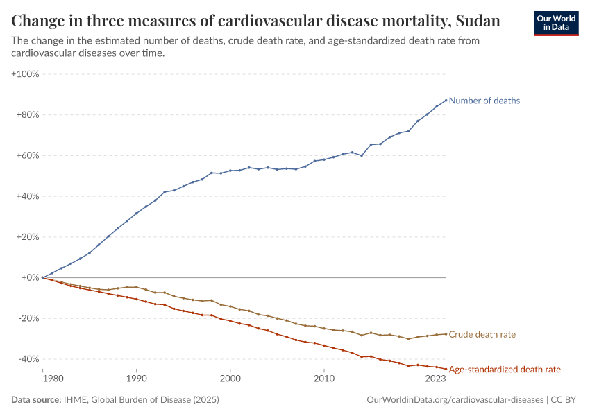 In the chart, you can see how death rates from communicable diseases in Sudan have changed over time. This is shown alongside neighboring countries for comparison.