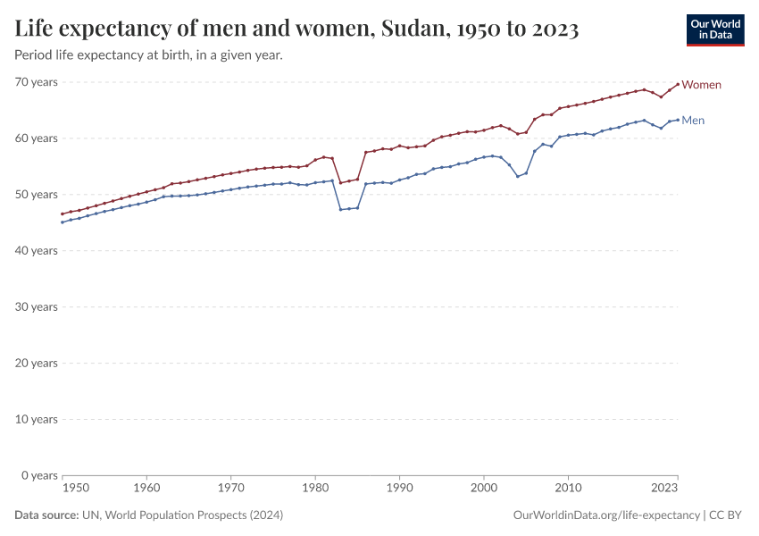In the chart, you can see life expectancy at birth for men and women in Sudan.