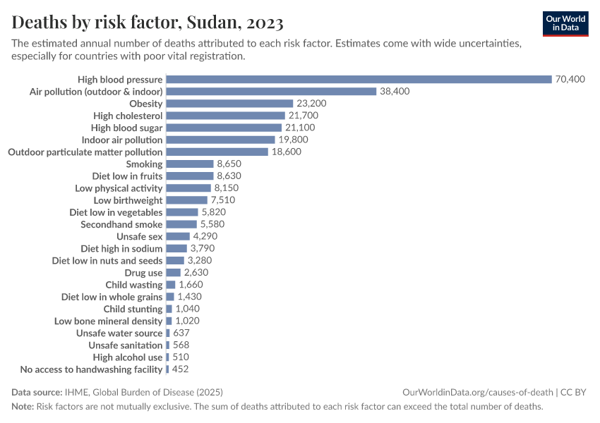 In the chart, you can see modeled estimates for how many people in Sudan die prematurely as a result of various risk factors. Note that the same death can be attributed to multiple risk factors, so the death tolls from different risk factors cannot simply be added up (this is why their sum can be higher than the total number of deaths).