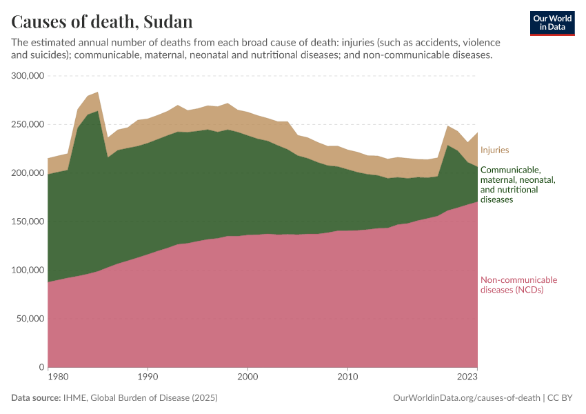 In the chart, you can see the breakdown of deaths in Sudan by these broad categories. In 2023, 35,800 died from communicable diseases, 170,000 from NCDs, and 35,500 from injuries.