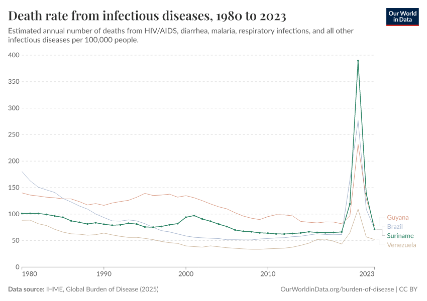 In the chart, you can see how death rates from communicable diseases in Suriname have changed over time. This is shown alongside neighboring countries for comparison.