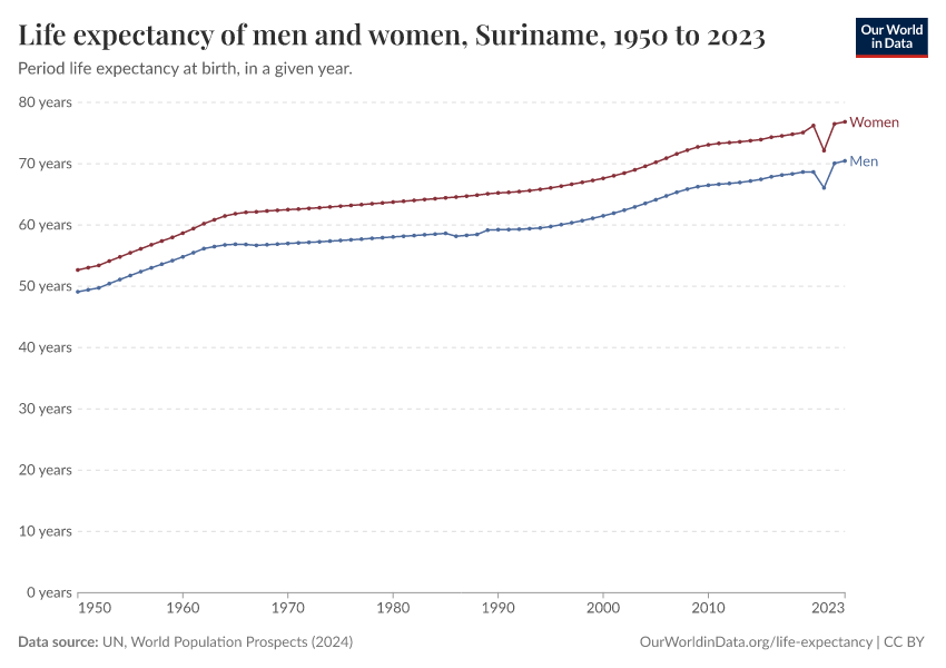 In the chart, you can see life expectancy at birth for men and women in Suriname.