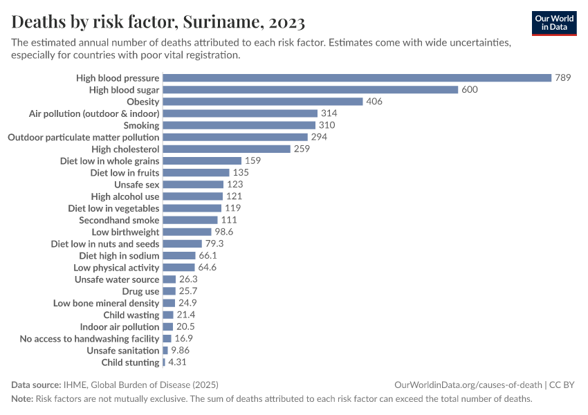 In the chart, you can see modeled estimates for how many people in Suriname die prematurely as a result of various risk factors. Note that the same death can be attributed to multiple risk factors, so the death tolls from different risk factors cannot simply be added up (this is why their sum can be higher than the total number of deaths).