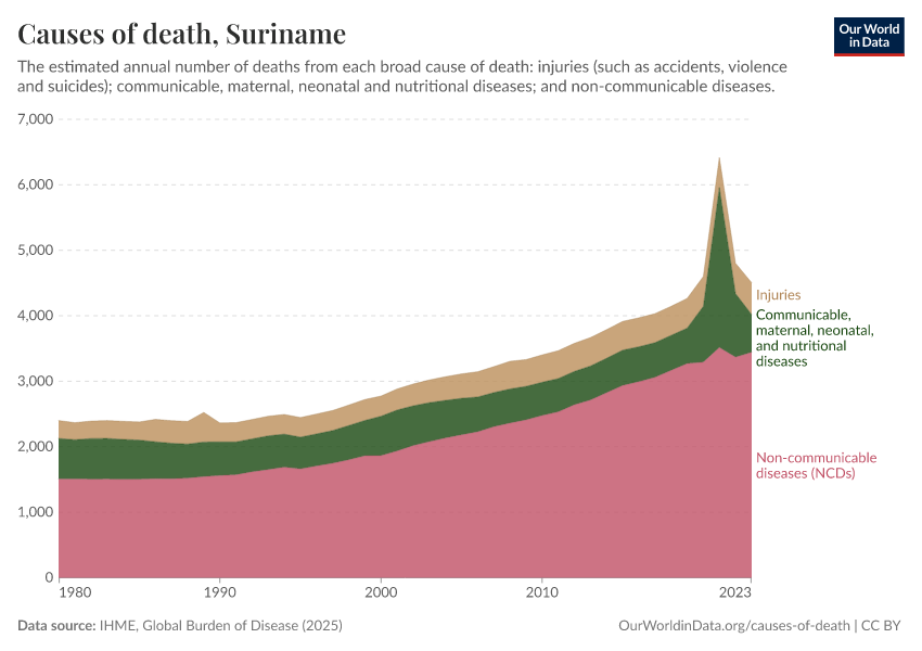 In the chart, you can see the breakdown of deaths in Suriname by these broad categories. In 2023, 578 died from communicable diseases, 3,440 from NCDs, and 486 from injuries.