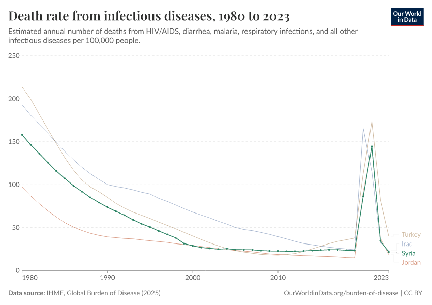 In the chart, you can see how death rates from communicable diseases in Syria have changed over time. This is shown alongside neighboring countries for comparison.