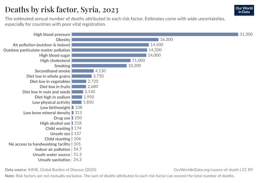 In the chart, you can see modeled estimates for how many people in Syria die prematurely as a result of various risk factors. Note that the same death can be attributed to multiple risk factors, so the death tolls from different risk factors cannot simply be added up (this is why their sum can be higher than the total number of deaths).