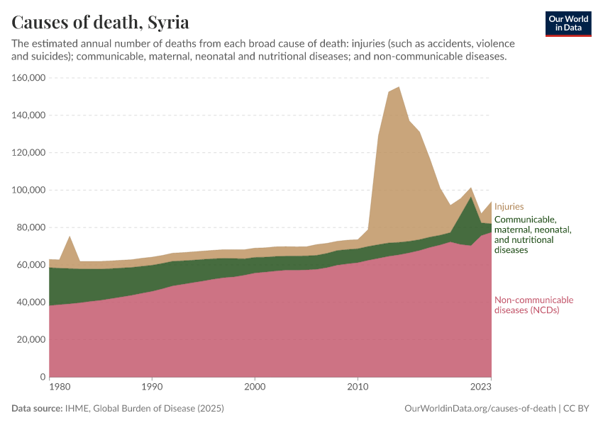 In the chart, you can see the breakdown of deaths in Syria by these broad categories. In 2023, 4,580 died from communicable diseases, 77,400 from NCDs, and 11,900 from injuries.