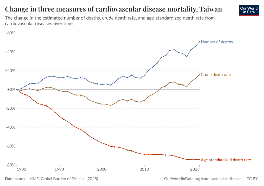 There are several metrics we can use to understand mortality: the total number of deaths, the crude death rate (which simply divides the number of deaths by the country’s population), or the age-standardized death rate, which holds the age structure of the population constant, removing the effect of population aging from the trend.