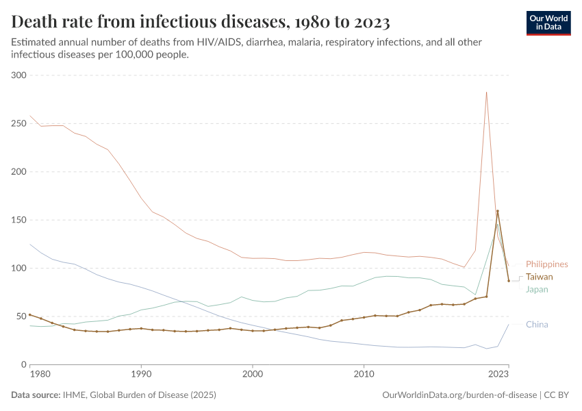 In the chart, you can see how death rates from communicable diseases in Taiwan have changed over time. This is shown alongside neighboring countries for comparison.
