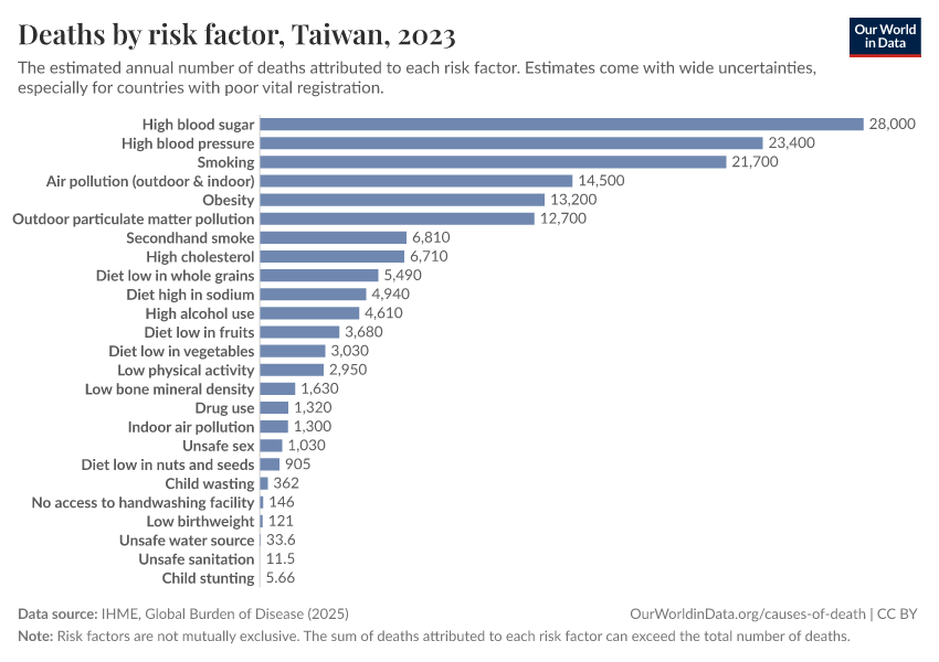In the chart, you can see modeled estimates for how many people in Taiwan die prematurely as a result of various risk factors. Note that the same death can be attributed to multiple risk factors, so the death tolls from different risk factors cannot simply be added up (this is why their sum can be higher than the total number of deaths).