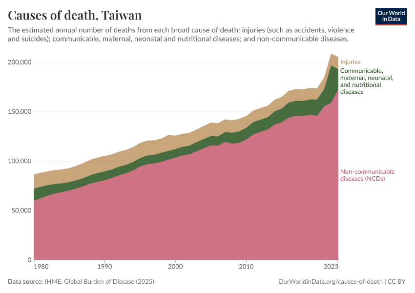 In the chart, you can see the breakdown of deaths in Taiwan by these broad categories. In 2023, 20,700 died from communicable diseases, 172,000 from NCDs, and 12,500 from injuries.