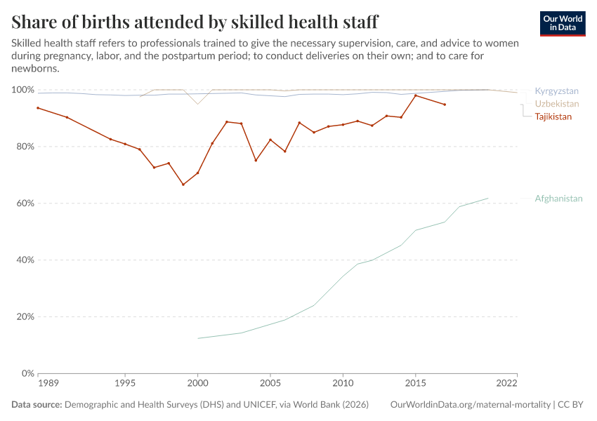 In the chart, you see the share of births attended by skilled workers in Tajikistan, alongside its neighbors. In 2017, this share was 95%.