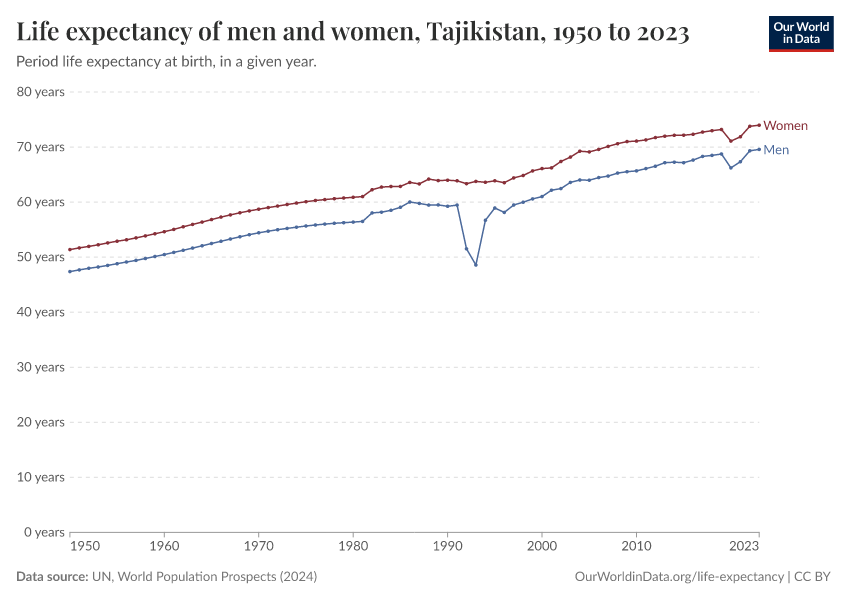 In the chart, you can see life expectancy at birth for men and women in Tajikistan.