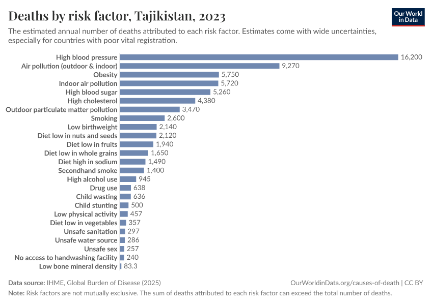 In the chart, you can see modeled estimates for how many people in Tajikistan die prematurely as a result of various risk factors. Note that the same death can be attributed to multiple risk factors, so the death tolls from different risk factors cannot simply be added up (this is why their sum can be higher than the total number of deaths).