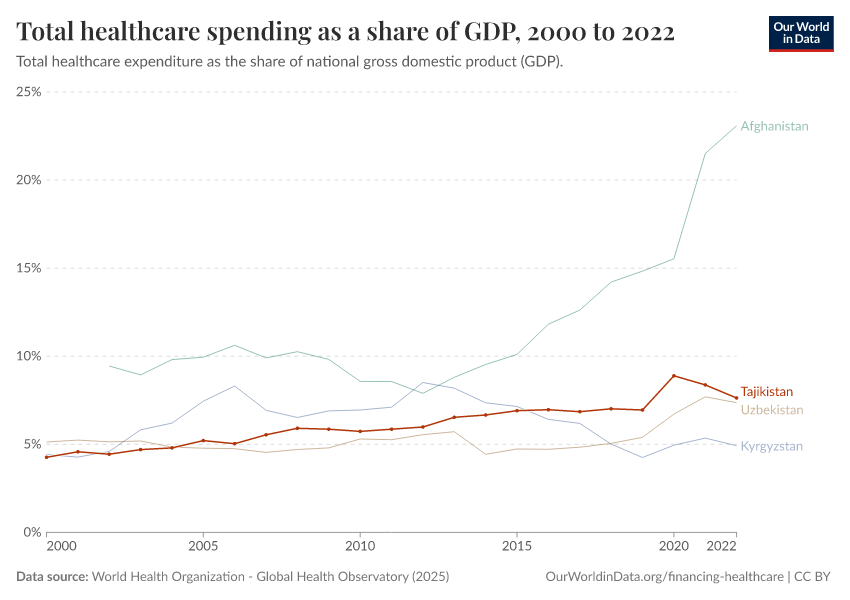 In 2022, Tajikistan’s healthcare spending was equivalent to 7.6% of its national gross domestic product (GDP).