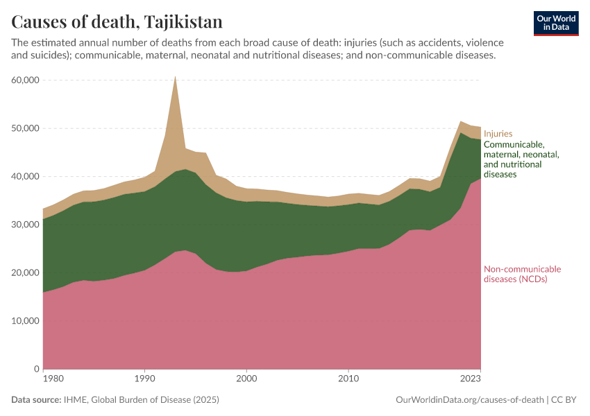 In the chart, you can see the breakdown of deaths in Tajikistan by these broad categories. In 2023, 8,080 died from communicable diseases, 39,600 from NCDs, and 2,600 from injuries.