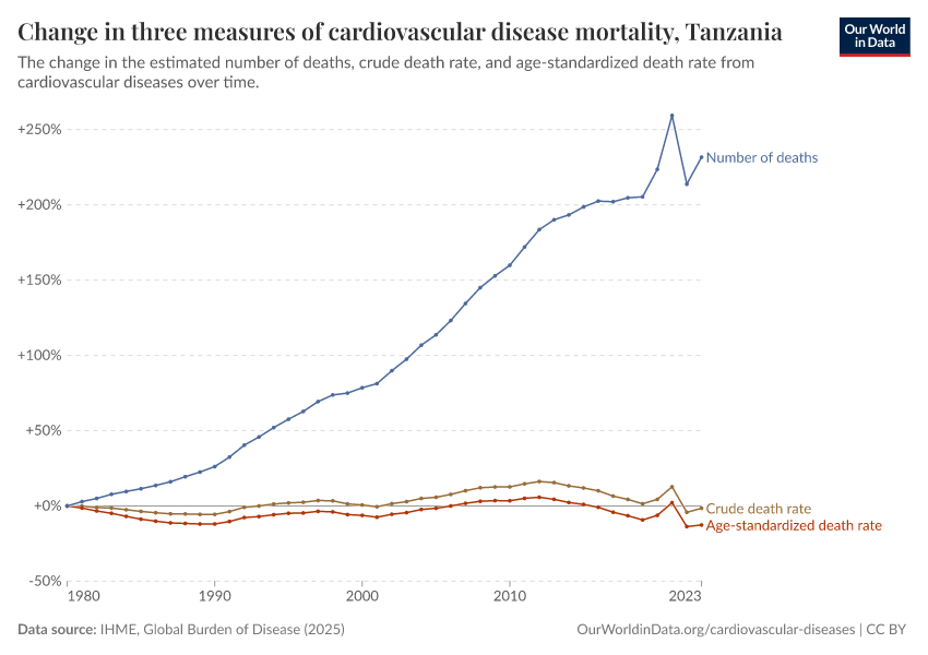 There are several metrics we can use to understand mortality: the total number of deaths, the crude death rate (which simply divides the number of deaths by the country’s population), or the age-standardized death rate, which holds the age structure of the population constant, removing the effect of population aging from the trend.