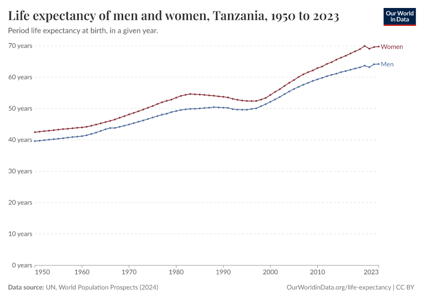In the chart, you can see life expectancy at birth for men and women in Tanzania.