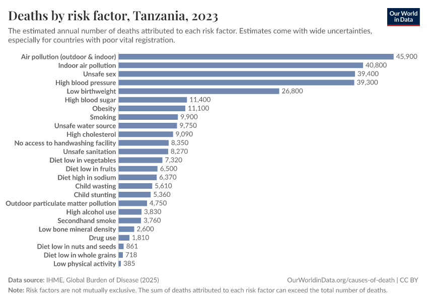In the chart, you can see modeled estimates for how many people in Tanzania die prematurely as a result of various risk factors. Note that the same death can be attributed to multiple risk factors, so the death tolls from different risk factors cannot simply be added up (this is why their sum can be higher than the total number of deaths).