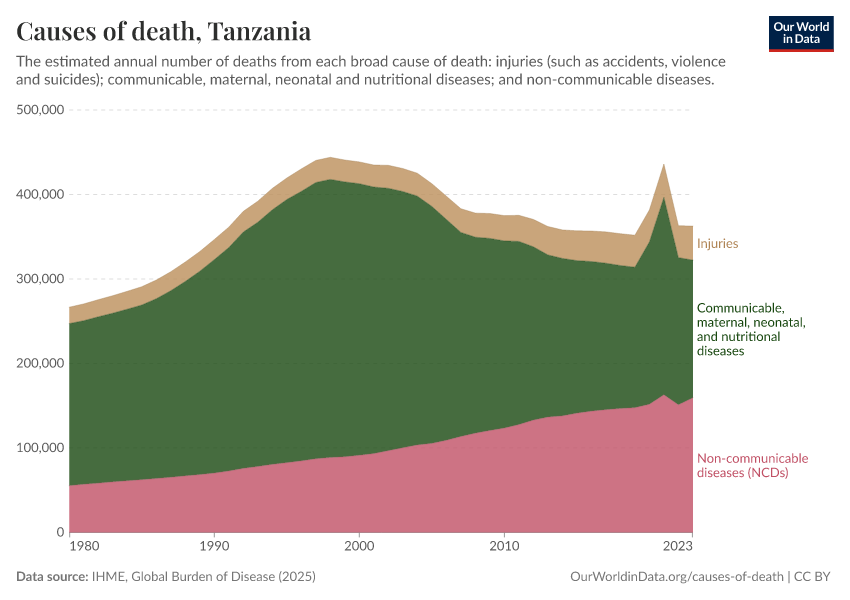 In the chart, you can see the breakdown of deaths in Tanzania by these broad categories. In 2023, 163,000 died from communicable diseases, 159,000 from NCDs, and 40,200 from injuries.