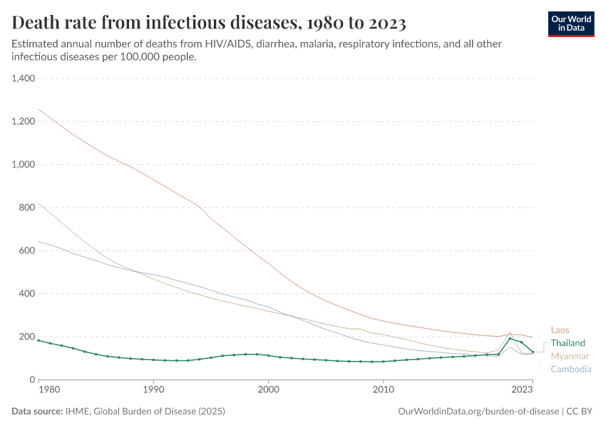 In the chart, you can see how death rates from communicable diseases in Thailand have changed over time. This is shown alongside neighboring countries for comparison.