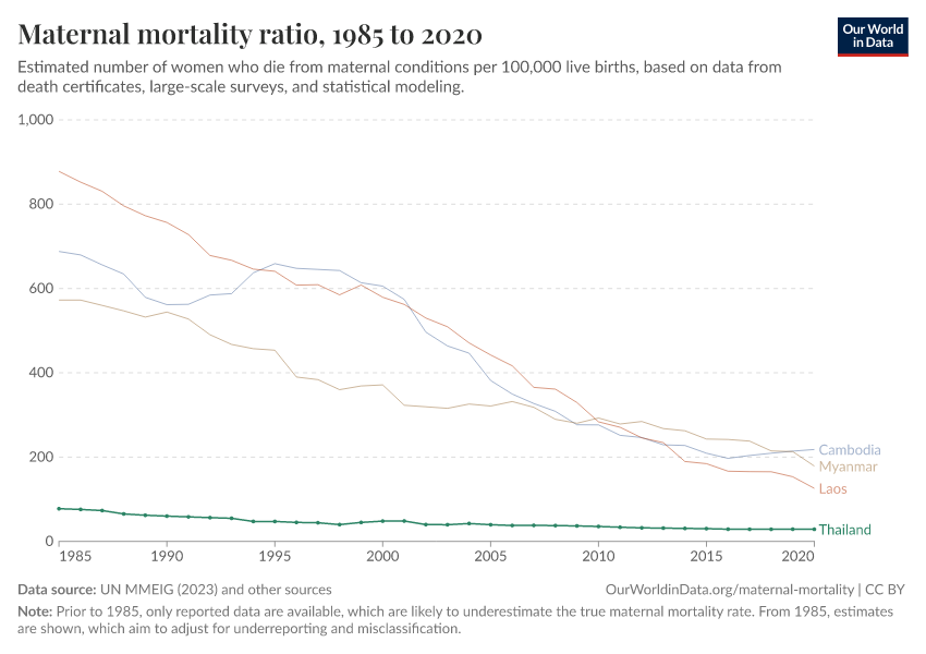 In the chart, you can see Thailand’s maternal mortality rates over time, alongside neighboring countries for comparison. This is measured as the number of deaths per 100,000 live births.