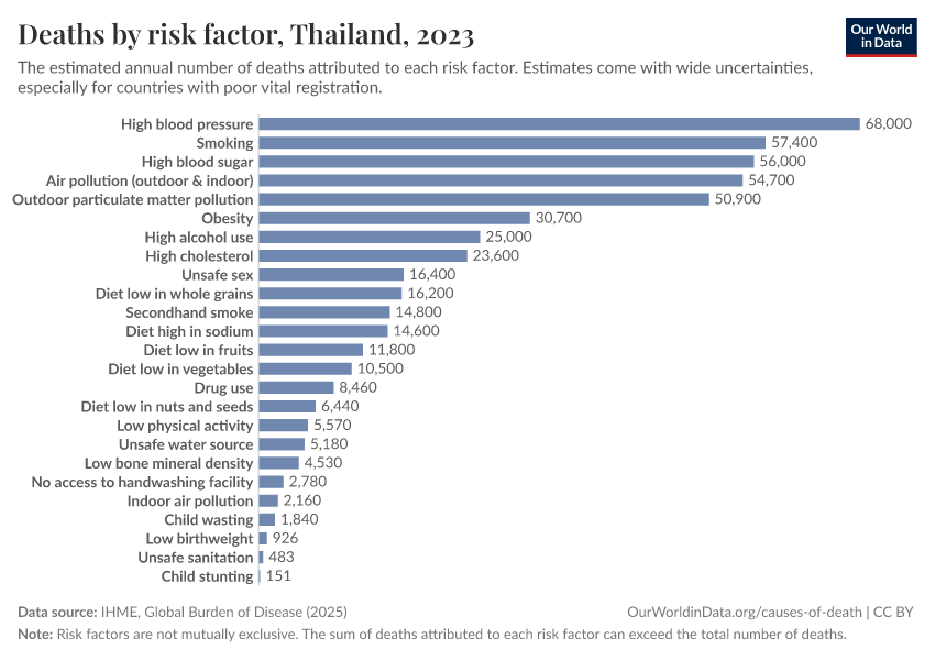 In the chart, you can see modeled estimates for how many people in Thailand die prematurely as a result of various risk factors. Note that the same death can be attributed to multiple risk factors, so the death tolls from different risk factors cannot simply be added up (this is why their sum can be higher than the total number of deaths).