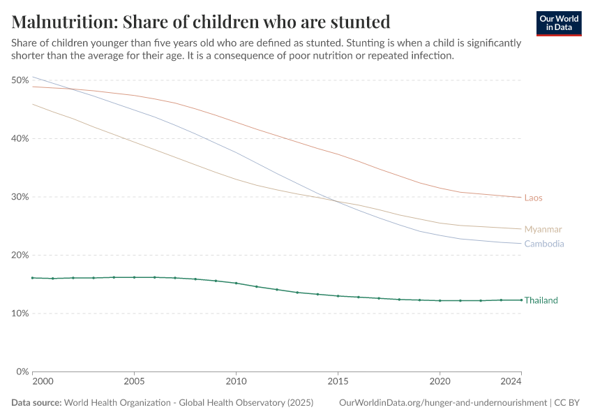In the chart, you can see what share of children in Thailand are stunted, alongside neighboring countries. In 2024, this share was 12.3%.