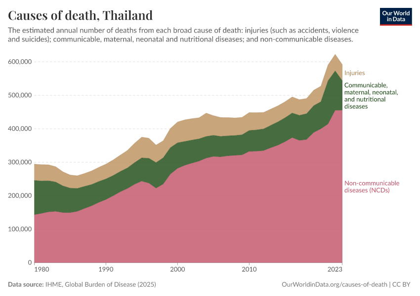 In the chart, you can see the breakdown of deaths in Thailand by these broad categories. In 2023, 88,200 died from communicable diseases, 455,000 from NCDs, and 48,200 from injuries.