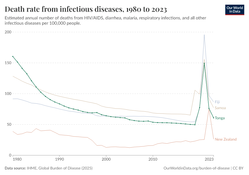 In the chart, you can see how death rates from communicable diseases in Tonga have changed over time. This is shown alongside neighboring countries for comparison.