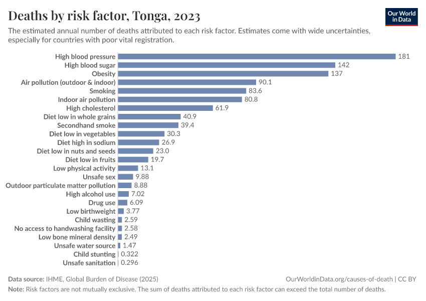 In the chart, you can see modeled estimates for how many people in Tonga die prematurely as a result of various risk factors. Note that the same death can be attributed to multiple risk factors, so the death tolls from different risk factors cannot simply be added up (this is why their sum can be higher than the total number of deaths).