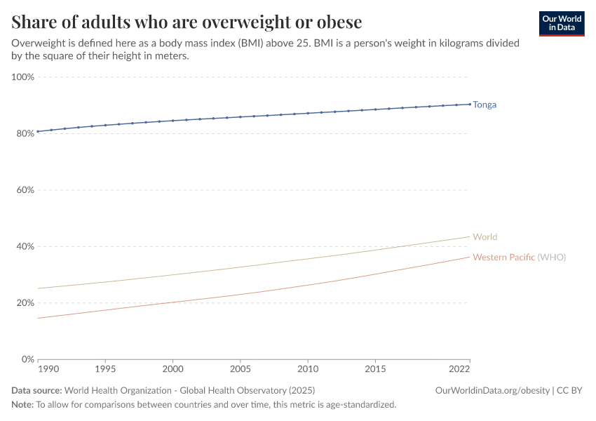 In the chart, you can see the share of adults in Tonga who are overweight or obese. This is defined as having a body mass index (BMI) equal to or greater than 25. This is shown alongside the global and regional averages.
