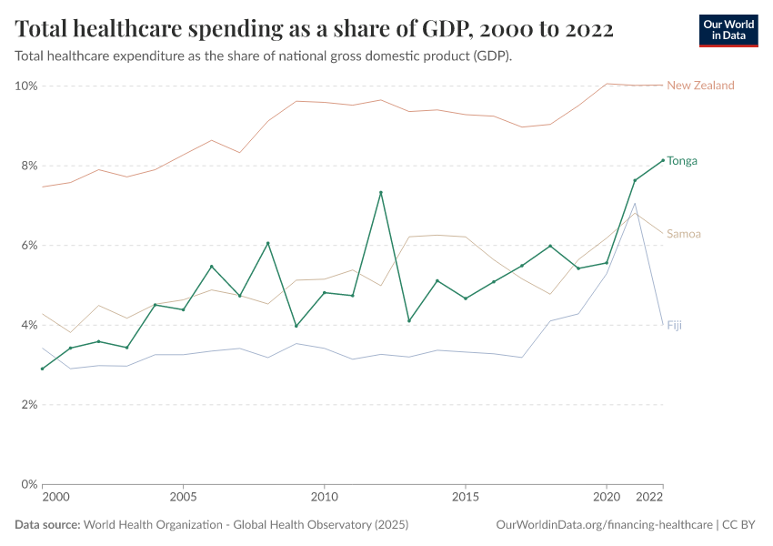 In 2022, Tonga’s healthcare spending was equivalent to 8.1% of its national gross domestic product (GDP).