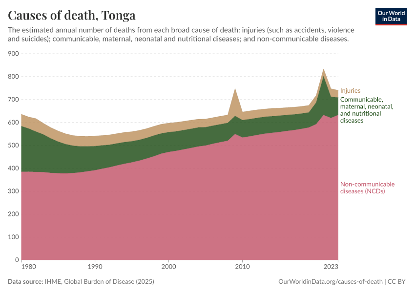 In the chart, you can see the breakdown of deaths in Tonga by these broad categories. In 2023, 76.1 died from communicable diseases, 633 from NCDs, and 31.4 from injuries.