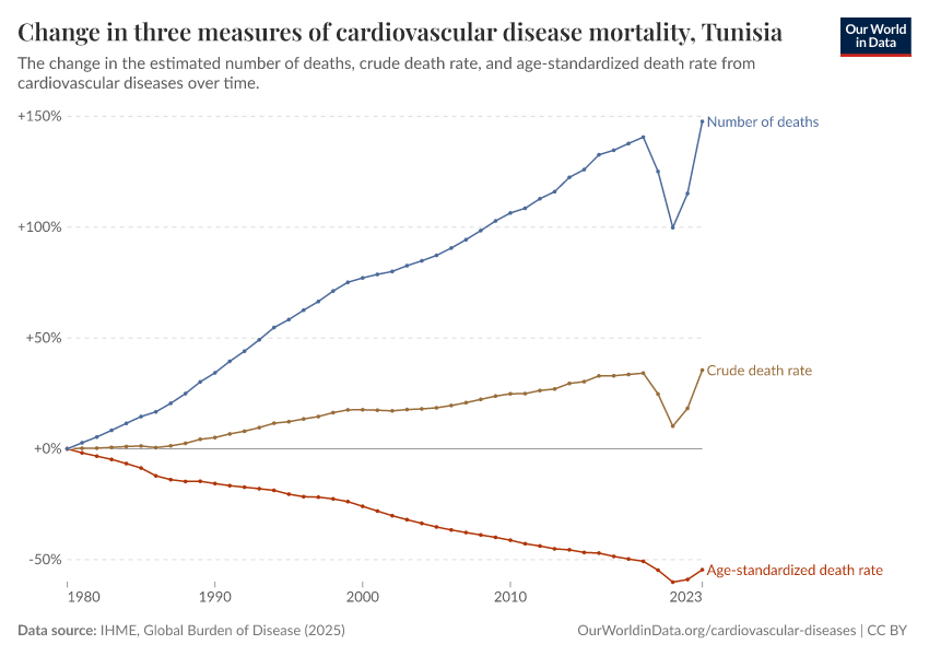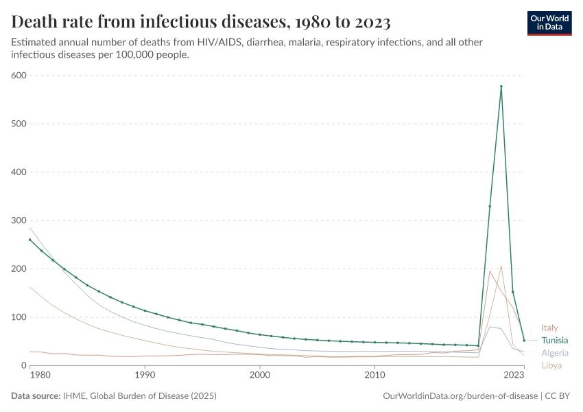 In the chart, you can see how death rates from communicable diseases in Tunisia have changed over time. This is shown alongside neighboring countries for comparison.