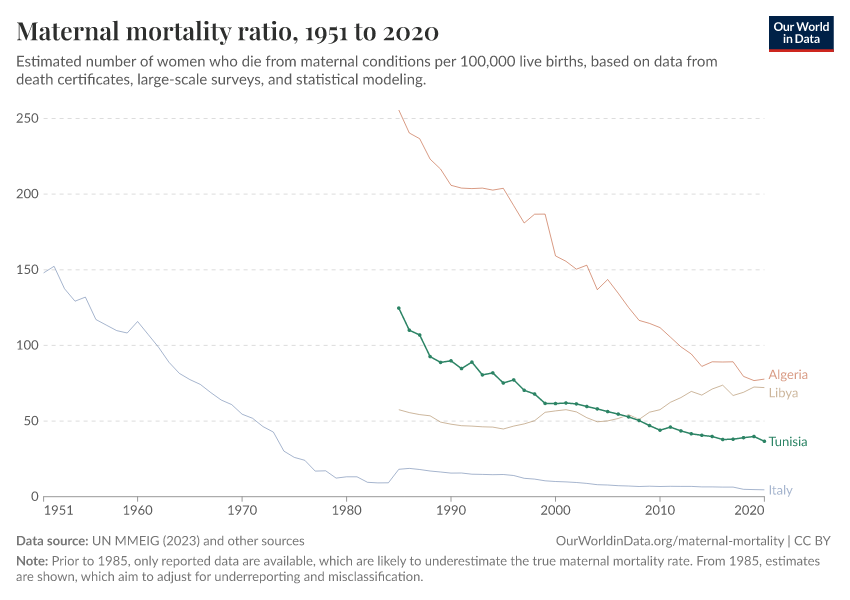 In the chart, you can see Tunisia’s maternal mortality rates over time, alongside neighboring countries for comparison. This is measured as the number of deaths per 100,000 live births.