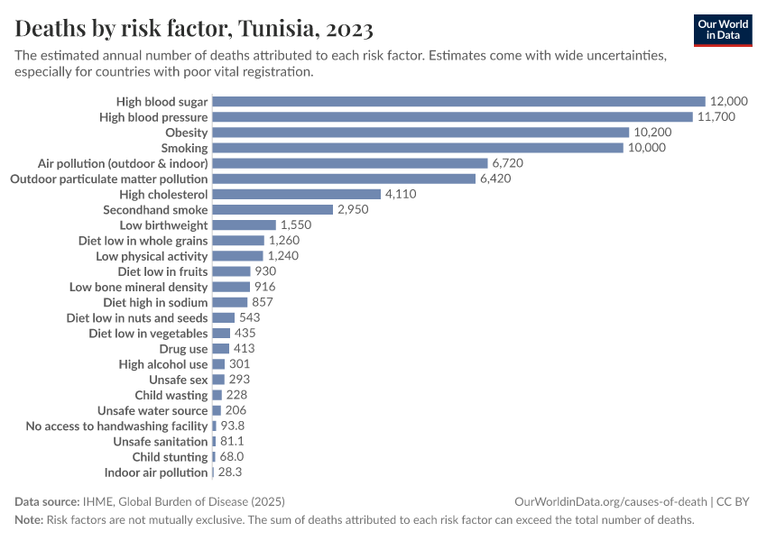 In the chart, you can see modeled estimates for how many people in Tunisia die prematurely as a result of various risk factors. Note that the same death can be attributed to multiple risk factors, so the death tolls from different risk factors cannot simply be added up (this is why their sum can be higher than the total number of deaths).
