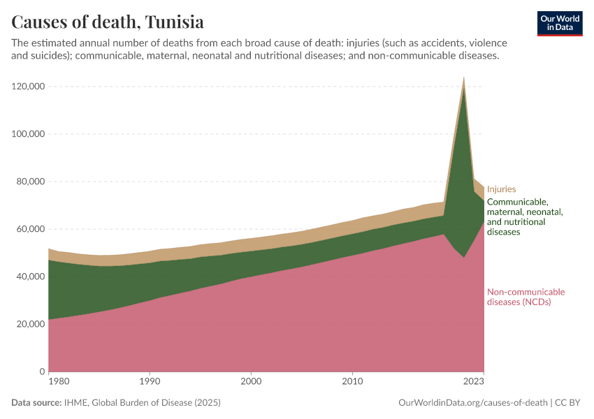 In the chart, you can see the breakdown of deaths in Tunisia by these broad categories. In 2023, 8,650 died from communicable diseases, 63,200 from NCDs, and 5,810 from injuries.