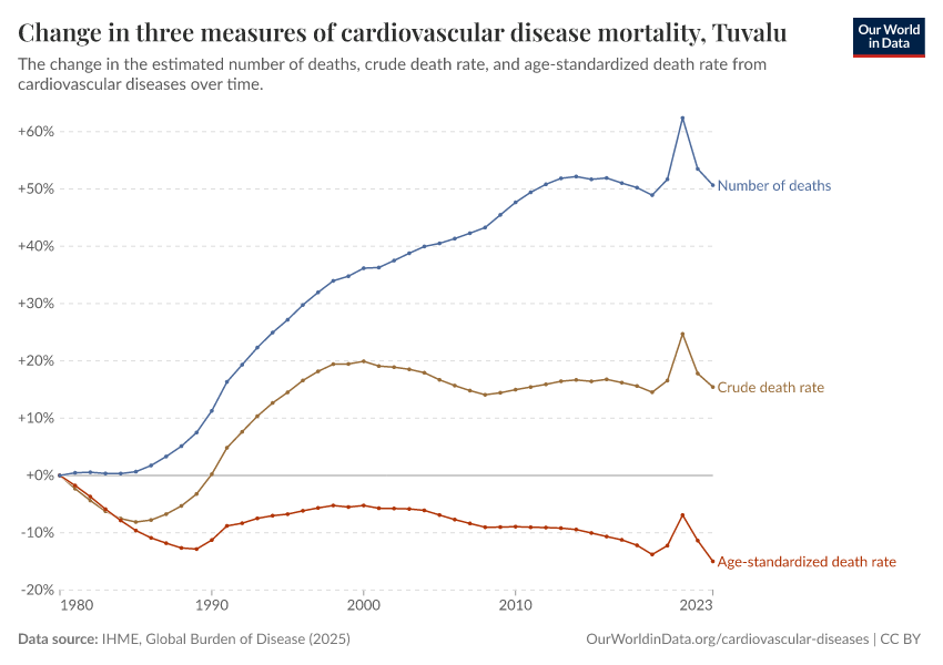 In the chart, you can see how death rates from communicable diseases in Tuvalu have changed over time. This is shown alongside neighboring countries for comparison.