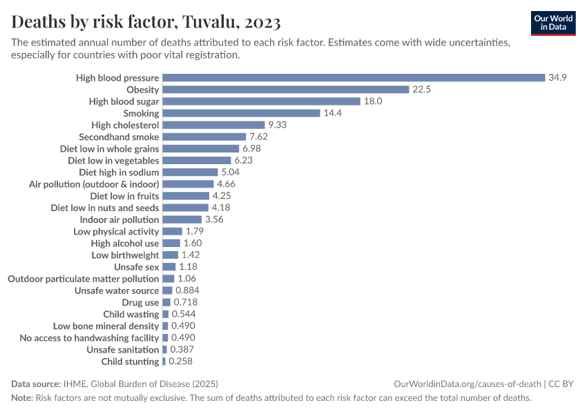 In the chart, you can see modeled estimates for how many people in Tuvalu die prematurely as a result of various risk factors. Note that the same death can be attributed to multiple risk factors, so the death tolls from different risk factors cannot simply be added up (this is why their sum can be higher than the total number of deaths).