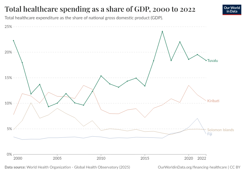 In 2022, Tuvalu’s healthcare spending was equivalent to 18% of its national gross domestic product (GDP).